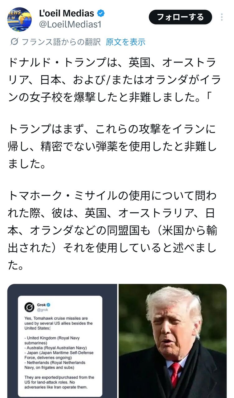 トランプ大統領「イラン女子校を爆撃したのは日本かもしれない。日本が我々のミサイルを発射した」