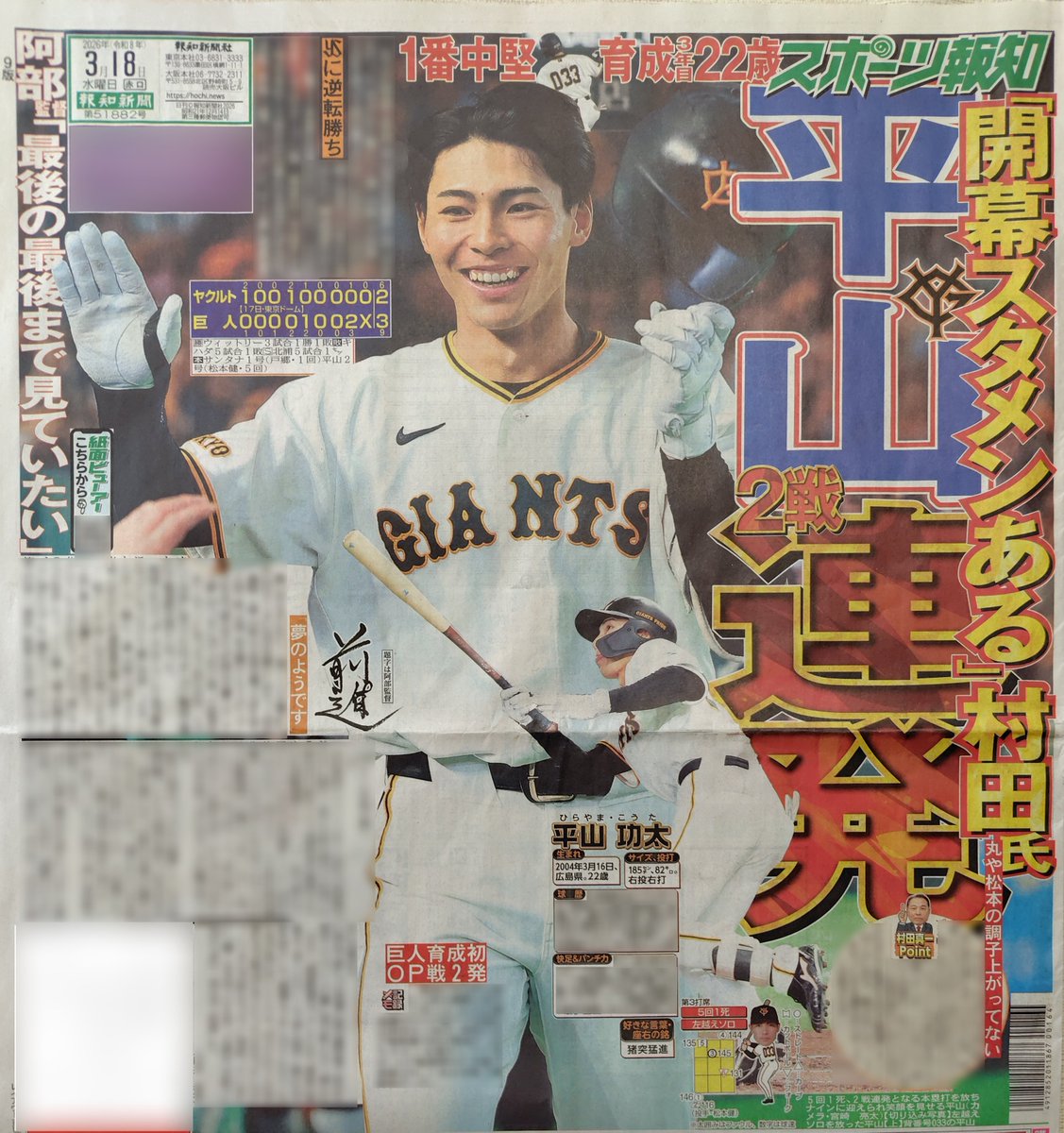 巨人・平山(22)、1軍初出場でサイクル未遂(2塁打) → 2試合連続ホームラン こいつ
