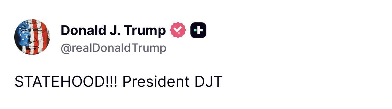 大統領はベネズエラでの勝利直後、自身のTruth Socialアカウントに「州昇格」という一言だけを投稿した。これは、米国における州となる可能性を示唆する言葉である。