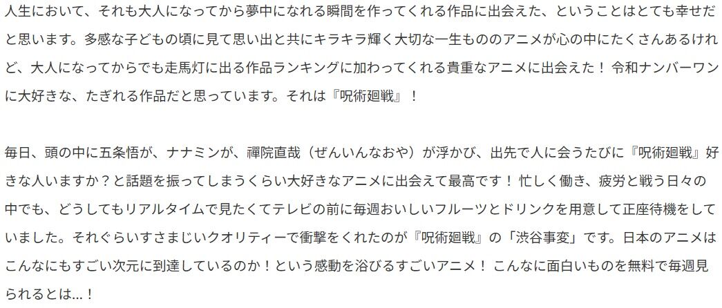 出先で人に会うたびに『呪術廻戦』好きな人いますか?と話題を振ってしまうくらい大好きなアニメに出会えて最高です!