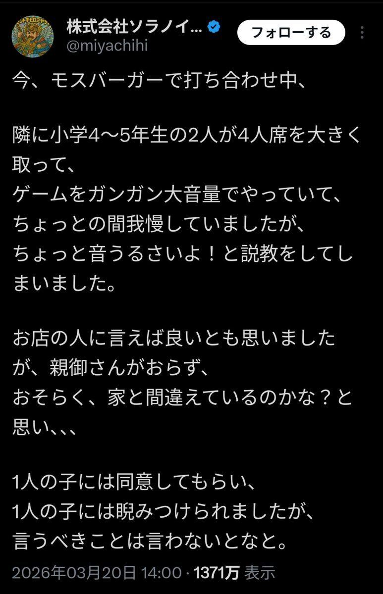 【悲報】ラーメン屋の社長さん、モスバーガーで騒いでる小学生にマジギレして炎上wwwwwwww