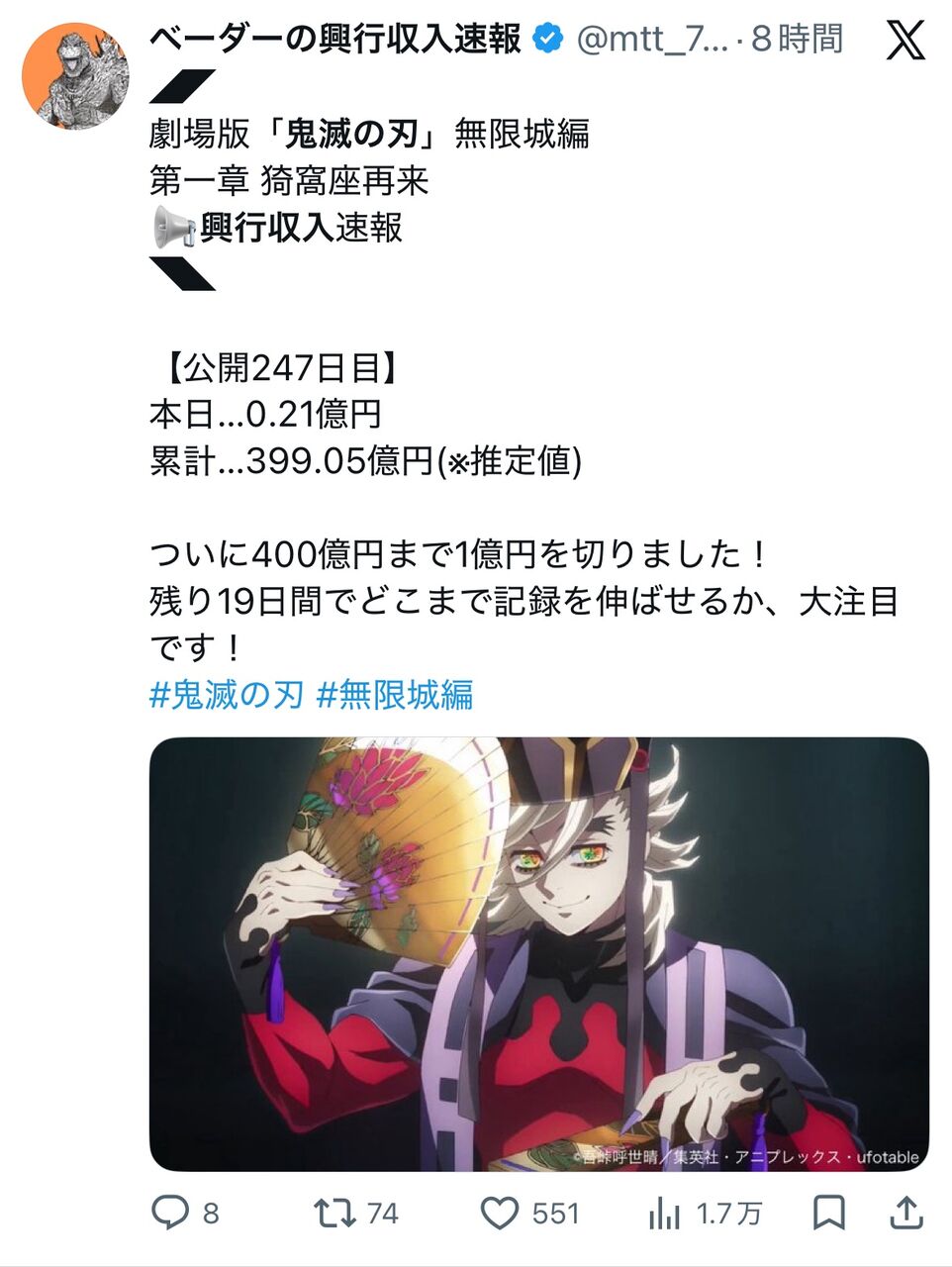 『鬼滅の刃 無限城編』、ついに興行収入399億になるwwwwwwwwww