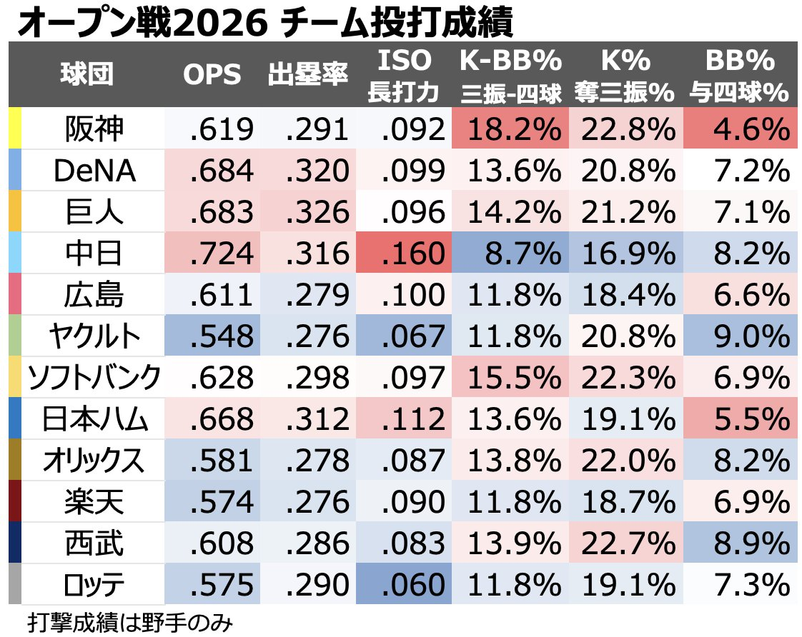 2026年オープン戦のチーム投打成績、出るwwwwwwwwwwwww