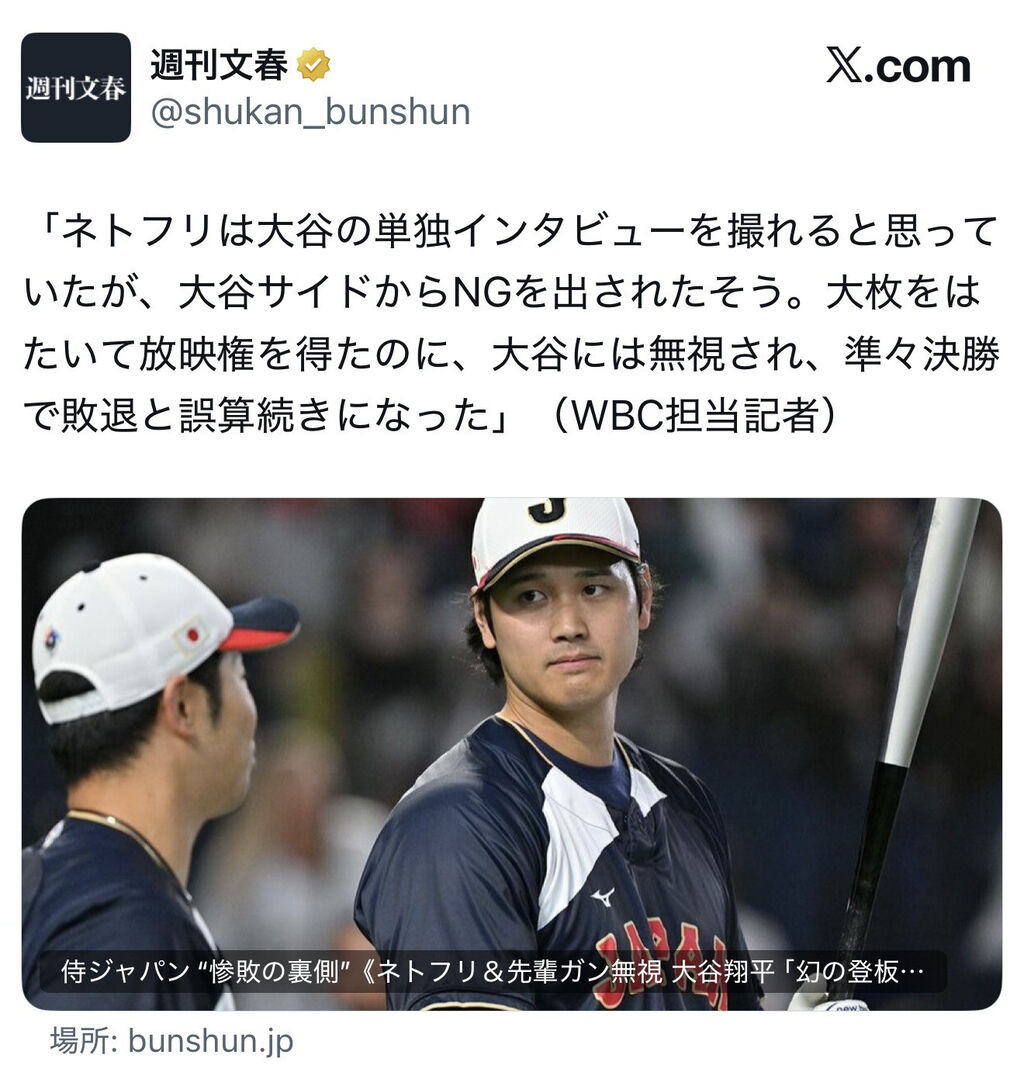 「ネトフリは大谷の単独インタビューを撮れると思っていたが、大谷サイドからNGを出されたそう。大枚をはたいて放映権を得たのに、大谷には無視され、準々決勝で敗退と誤算続きになった」