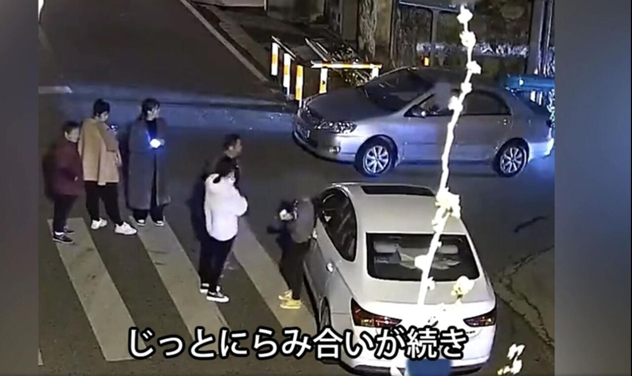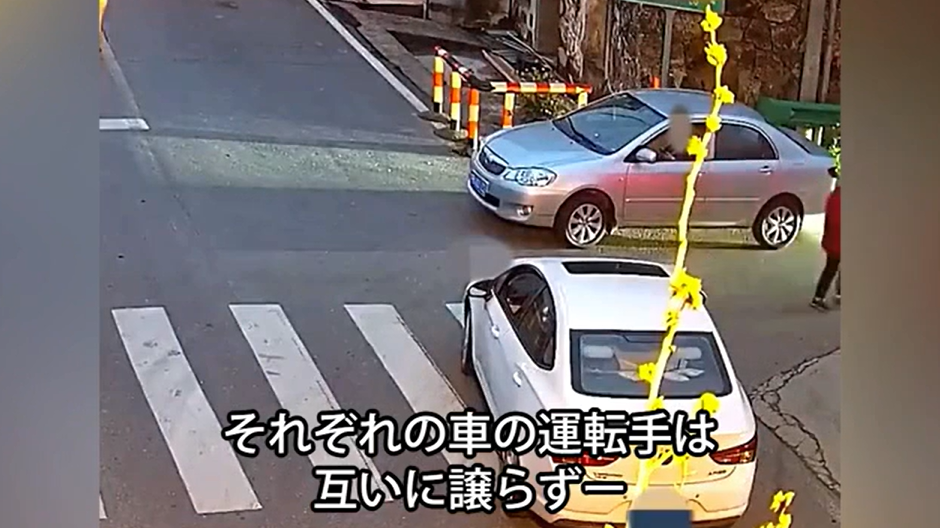 中国東部の江蘇省にある村の交差点で2台の車が鉢合わせた。