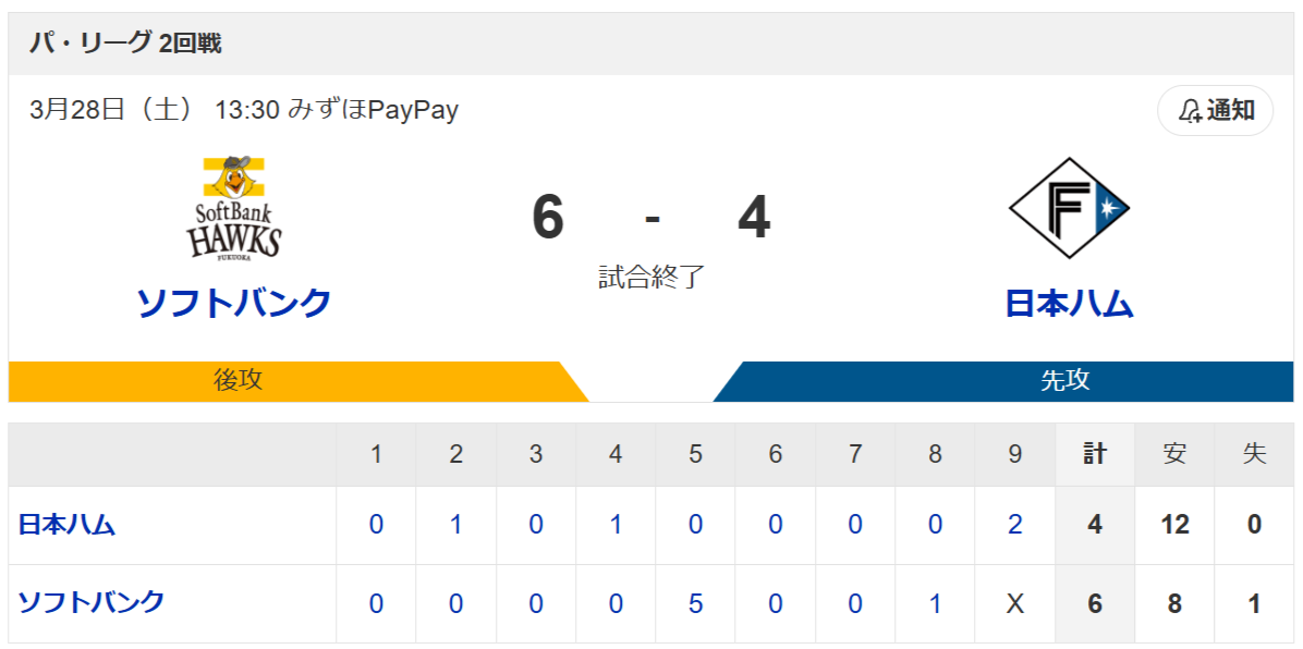 エースの伊藤大海投手で開幕戦を落とし、プレシーズン戦を無失点で締めくくった期待の達孝太投手を2戦目の先発マウンドに送ったが、2点をリードしていた5回に3本の適時打を含む4連打を浴びるなど逆転を許して5点を献上した。