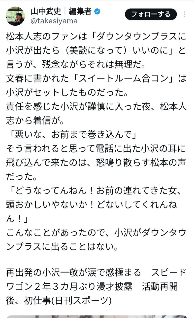 【悲報】松本人志、小沢さんにブチギレ!覇権サブスクのダウンタウン+出禁にwwwwwwww