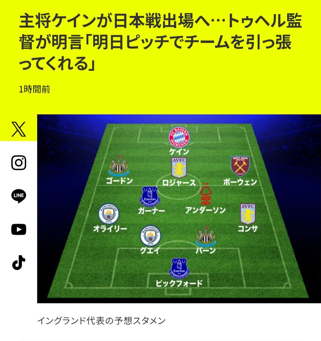 【朗報】サッカーイングランド代表、とんでもないメンバーで日本代表に襲い掛かる