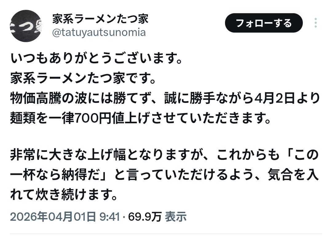 家系ラーメンさん、700円値上げの告知でクソ叩かれるwwwwwwwww