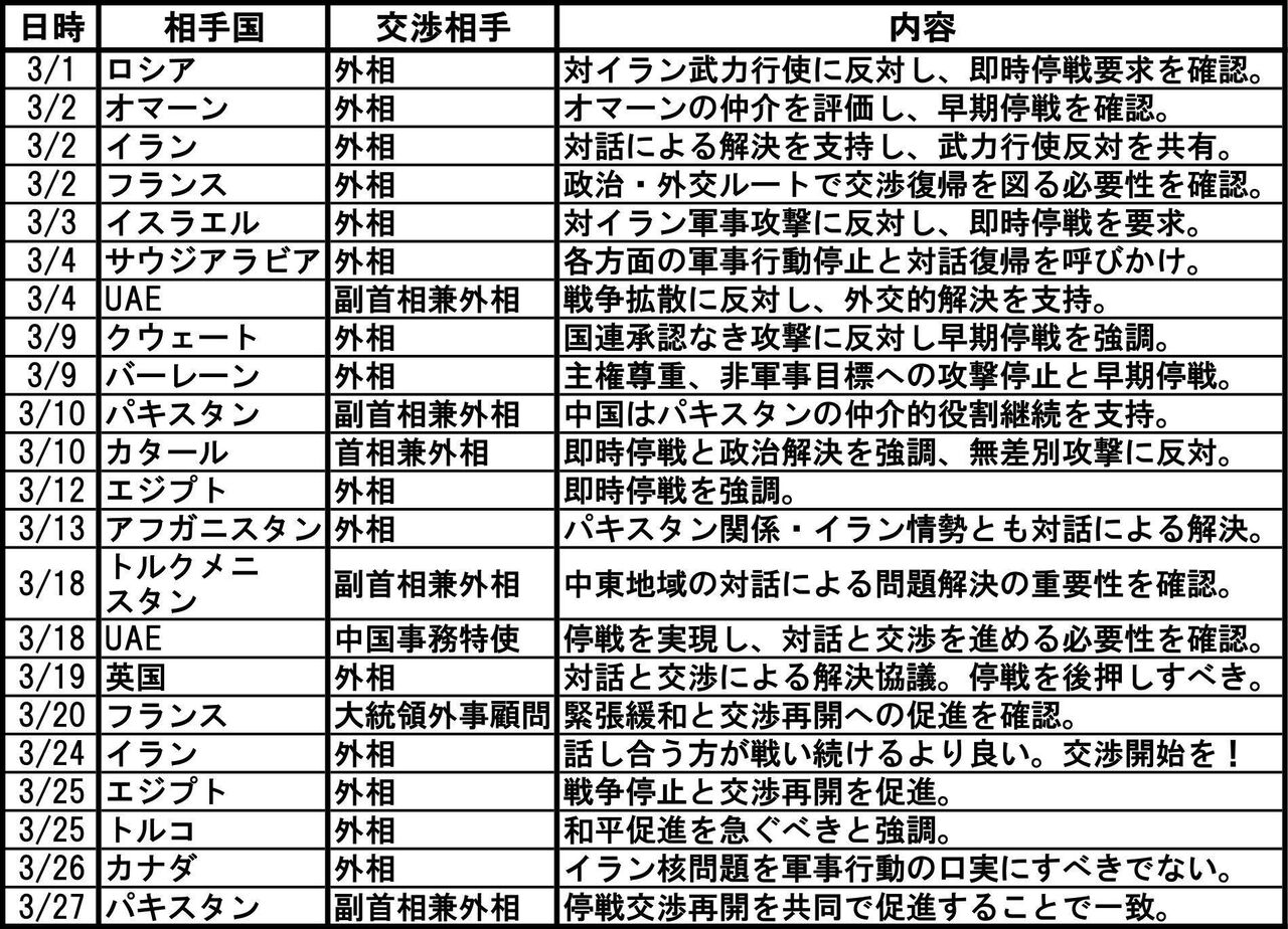 (前略)イラン攻撃について、中国の王毅外相兼中共中央政治局委員は、ひたすら「早期停戦」を関係国に呼びかけている。その例を拾って図表に示した。