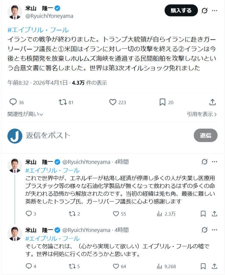 中道改革連合の米山隆一前衆院議員が2026年4月1日に、「エイプリルフールネタ」として、「イランでの戦争が終わりました」などと投稿した。批判が寄せられたが、「平和がエイプリル・フールの嘘でしか言えない現実を憂いています」と意図を説明し反論した。