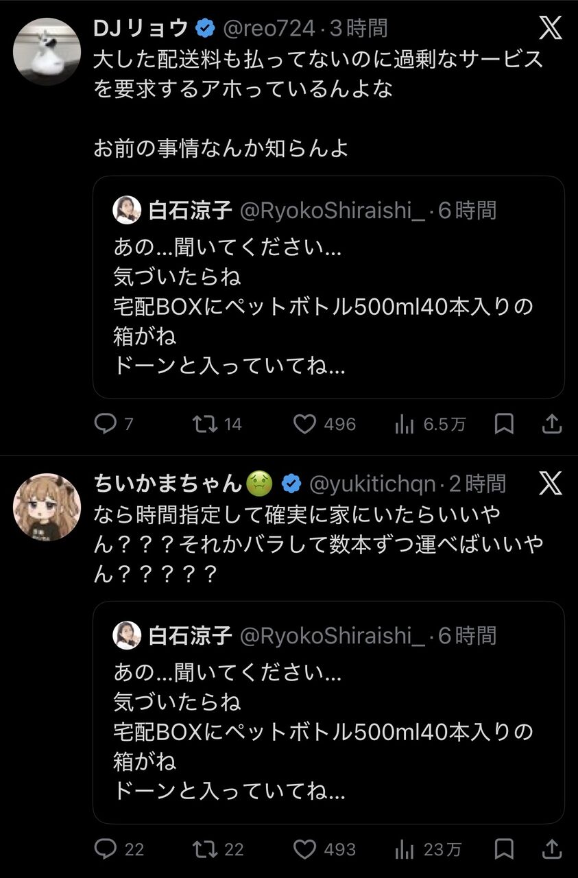 声優の白石涼子さんが2026年4月2日にXで、宅配で頼んでいるペットボトル40本入りの箱が宅配BOXに入れられ、持ち運べない状態であると明かし、ネット上から賛否両論を集めている。