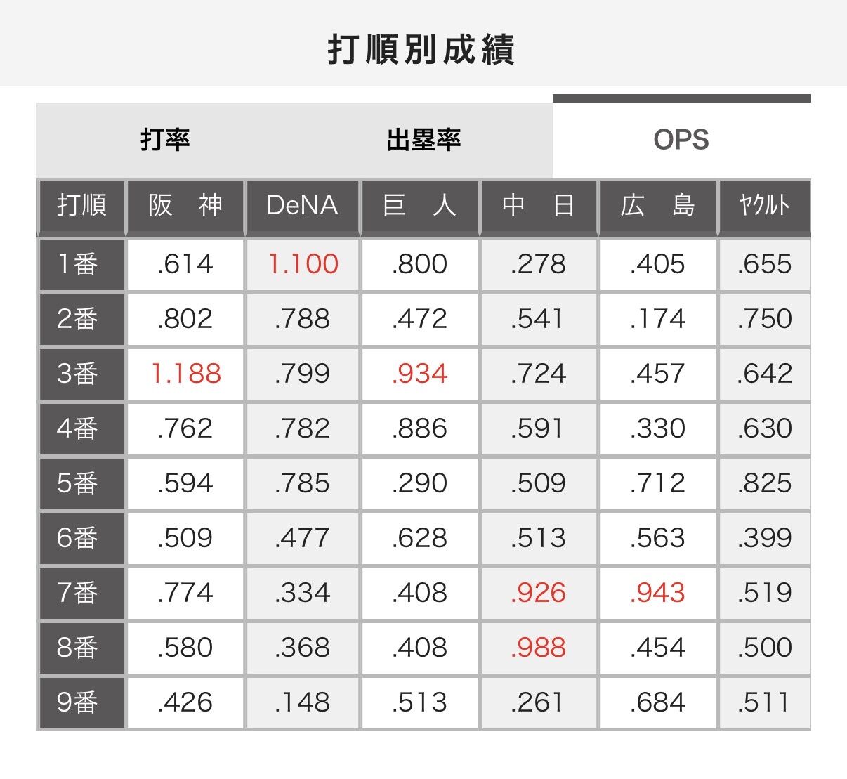 【最新版】セリーグ・打順別OPS、更新されるwwwwwwwwww