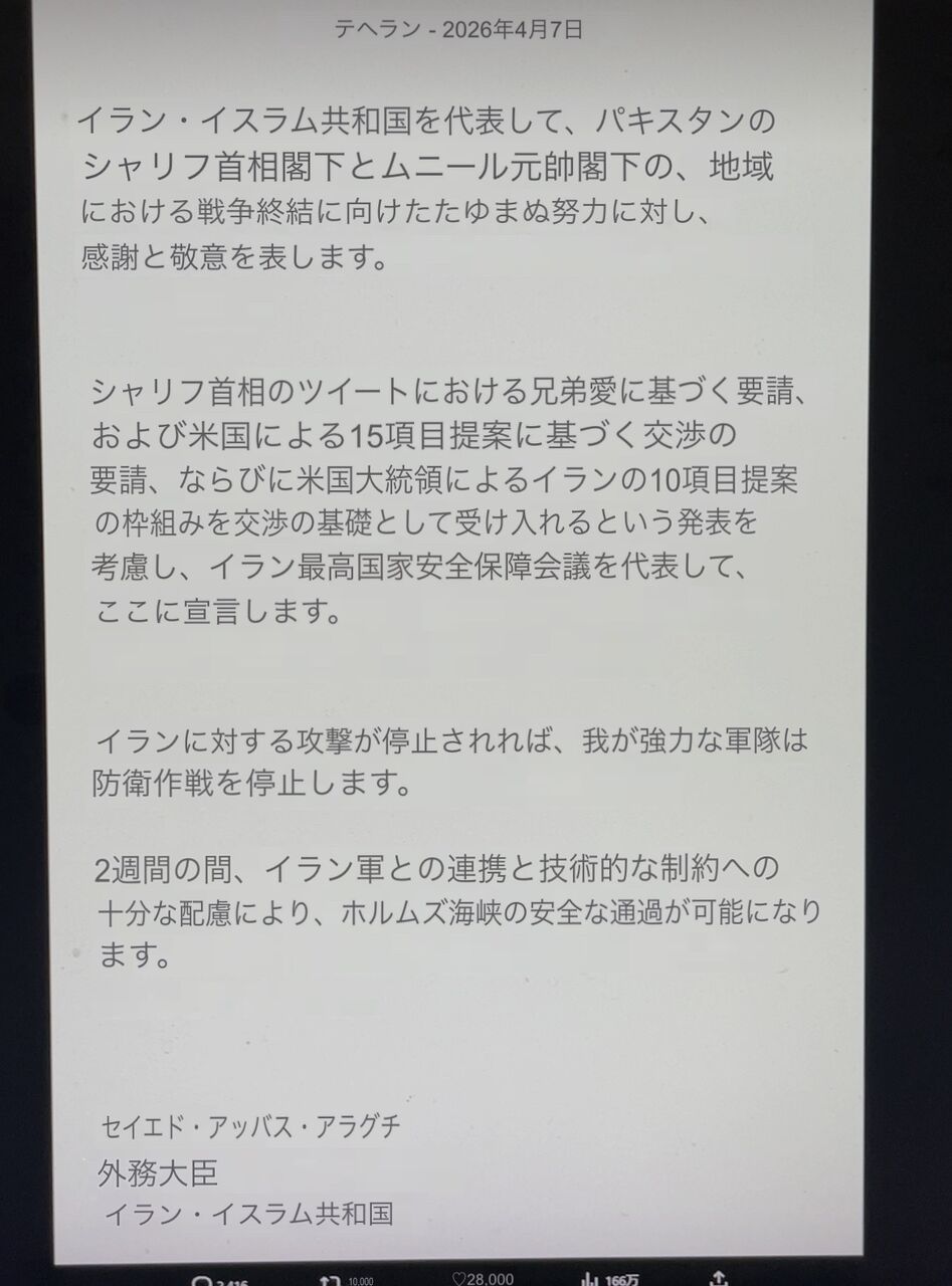 イラン国営通信(IRNA)によると、戦闘終結に向けた10項目の提案をパキスタンに示した。一時的な停戦ではなく恒久的な戦闘停止の必要性を強調した。地域紛争の終結や、ホルムズ海峡の安全航行に関す..