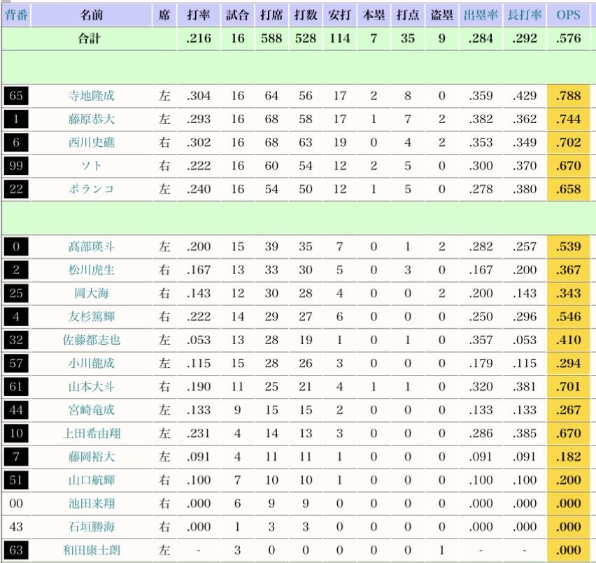 ロッテ寺地(高卒3年目20歳) 打率.304(チーム1位) 2本塁打(チーム1位) 8打点(チーム1位) OPS.788(チーム1位)
