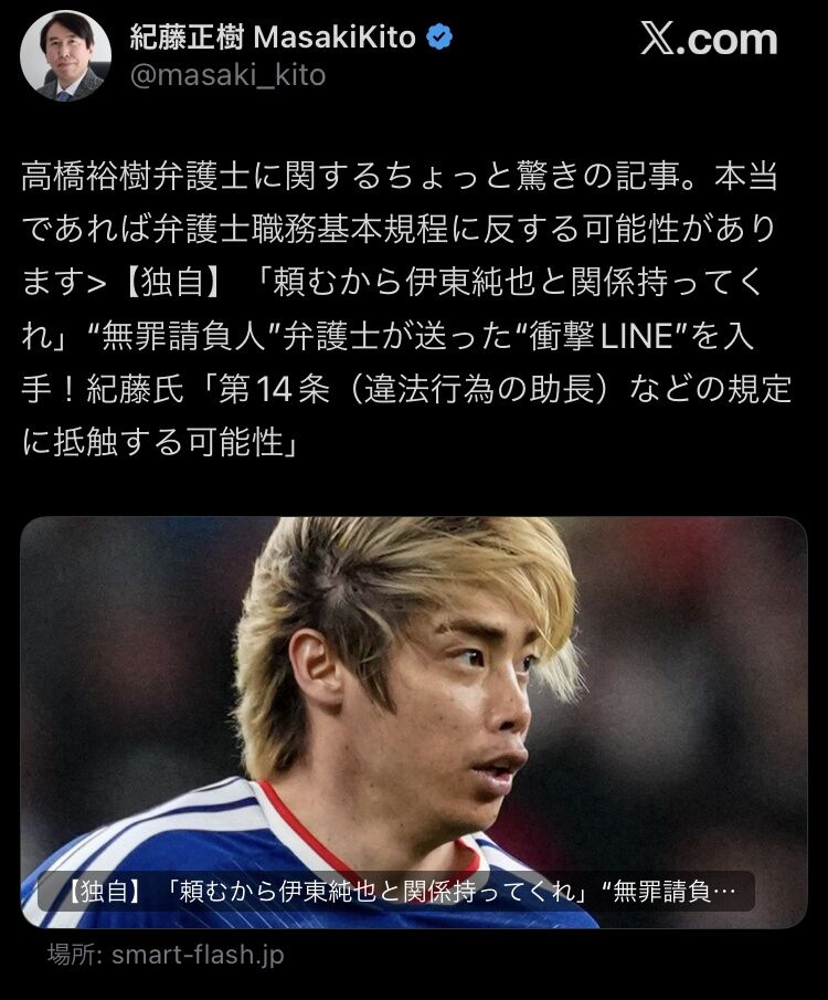 【独自】「頼むから伊東純也と関係持ってくれ」“無罪請負人”弁護士が送った“衝撃LINE”を入手!