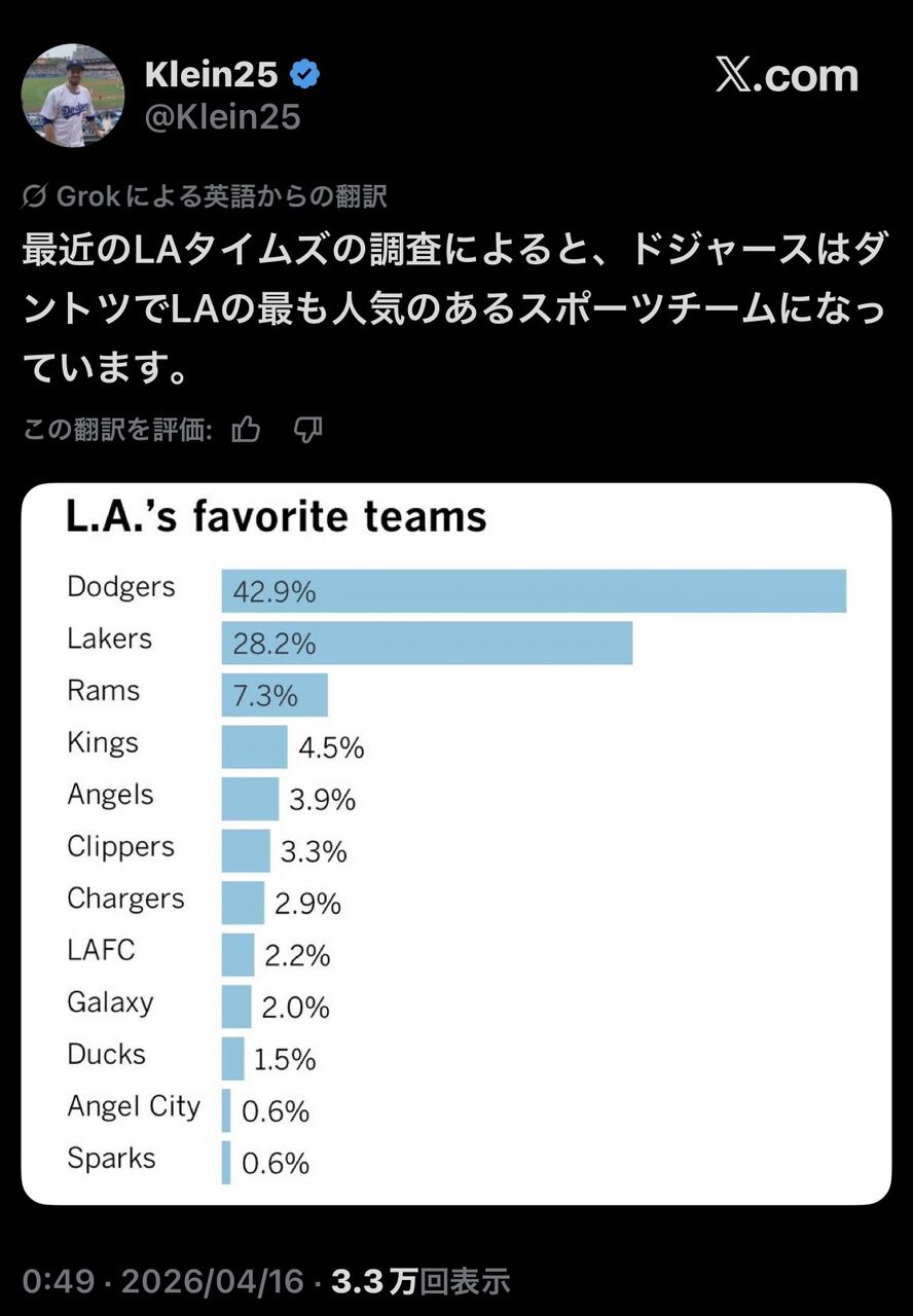 【朗報】LAタイムズ「ロサンゼルスで1番人気な球団はドジャースだわw」