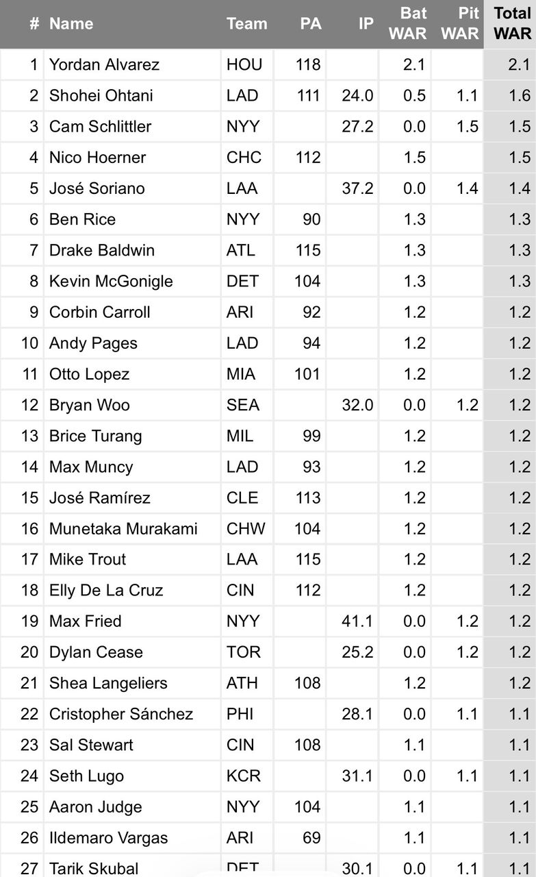 大谷翔平さん、本日時点で余裕でナ・リーグWARランキング単独1位に躍り出る