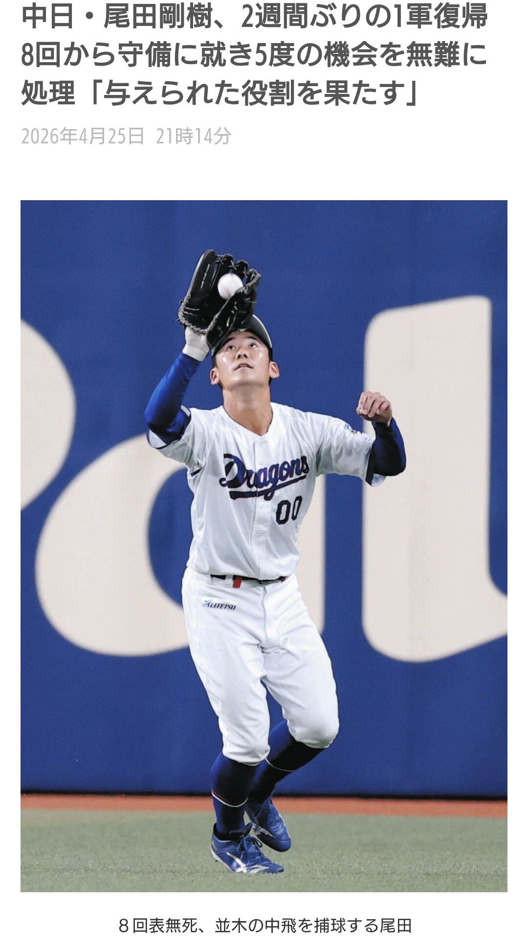 【画像】中日スポーツ「尾田が守備についたぞおおおお!!」パシャリ