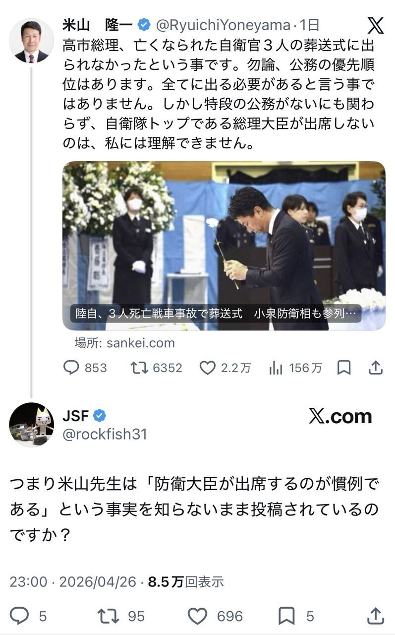 レスバおじさん「え?高市葬式出ないの?」ネット軍師「いや防衛大臣が出るのが慣習だが?😅」