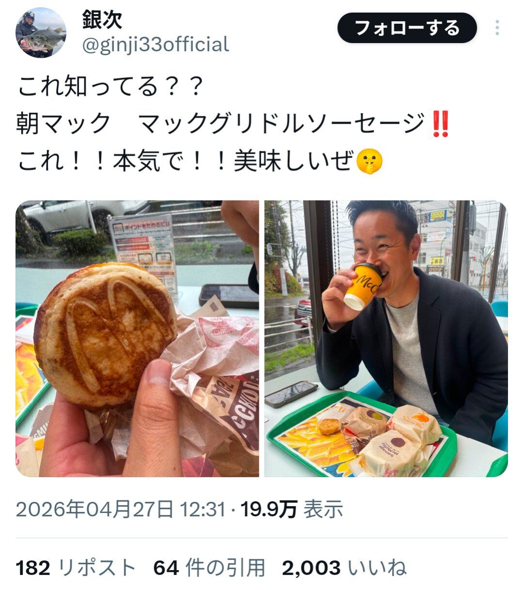 【画像】元楽天・銀次「これ知ってる??朝マック マックグリドルソーセージ!これ!!本気で!!美味しいぜ🤫」