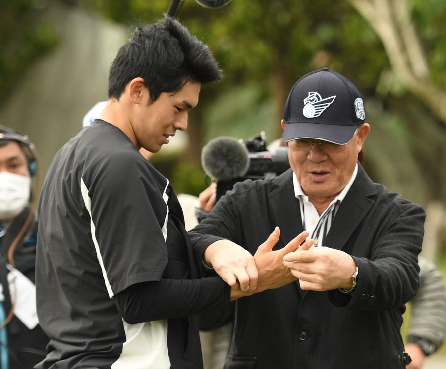 ドラフト1位ルーキーの佐々木朗希が、視察に訪れていた野球解説者の張本勲氏にあいさつし、言葉をかわした。